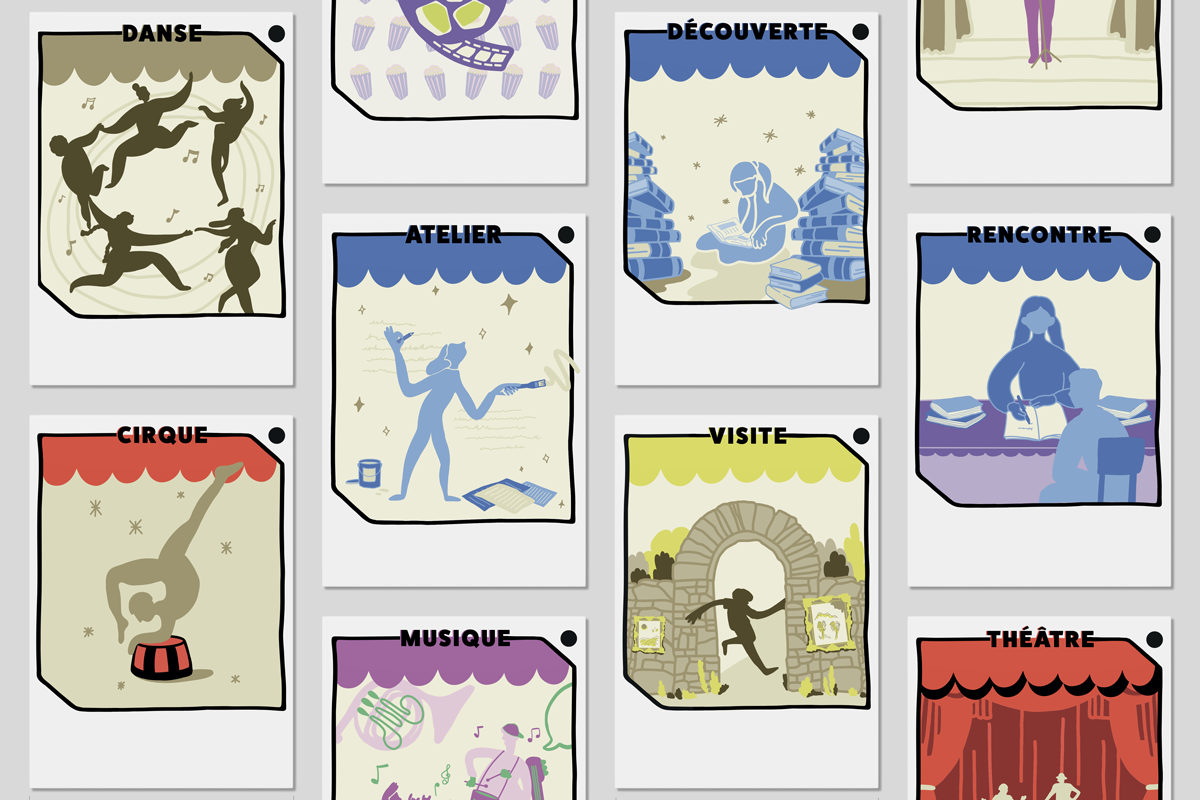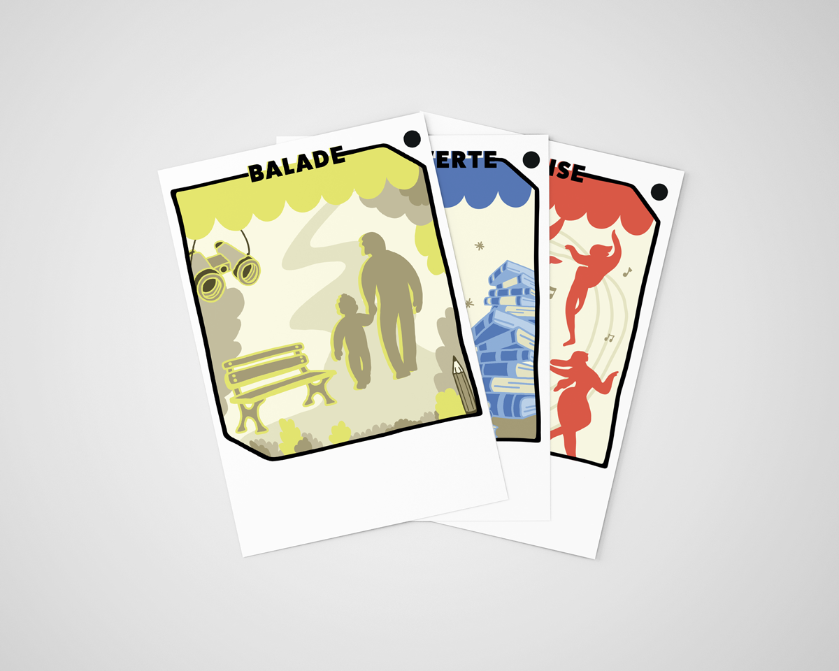 En collaboration avec la structure A-ttrait, gérée par Laurie DURAN qui est elle-même spécialisée en design sociétal à Aix-Les-Bains, nous avons imaginé des supports illustrés. Sous forme de cartes, les différentes catégories cultuelles sont représentées. Leur Design est minimaliste, coloré et parlant au premier regard pour les programmateurs en herbe qui vont se les approprier. Des supports ayants pour but de créer cohésion, dialogue et réflexion pour ces jeunes et leur famille qui ont rarement l'opportunité de participer à l'ensemble des activités culturelles proposées par leur ville.